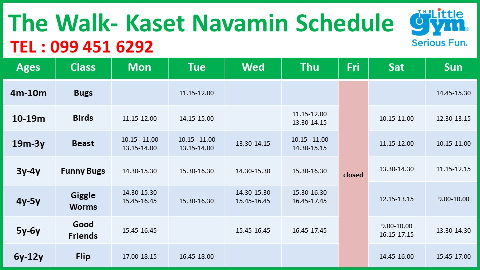 รูปแบบกิจกรรมในคลาส คุณพ่อคุณแม่ ไม่ต้องเข้าคลาสด้วย เพราะ เป็นคลาสที่นอกเหนือจากการออกกำลังกายและฝึกทักษะของยิมนาสติกแล้ว เด็กจะต้องถูกฝึกให้ มีความมั่นใจในตัวเอง มีความเป็นตัวของตัวเอง คันพบสิ่งใหม่ ความท้าทายใหม่ และเล่นกับเพื่อน ได้โดยไม่ต้องมีคุณพ่อคุณแม่ เป็นการเตรียมความพร้อมก่อนเข้าเรียน ในคลาสเด็กจะเรียนรู้ผ่านการเล่น – การได้ ”ลงมือทำเอง” และกิจกรรมการเรียนอย่างมีแบบแผนจะกระตุ้นให้เด็ก เรียนรู้, ออกกำลังกาย และเล่นสนุกไปพร้อมๆกัน